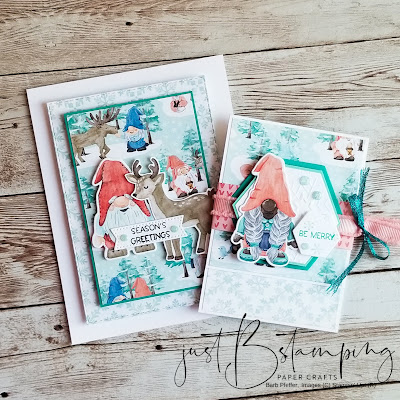 2nd Piece (foreground): Another piece of the Gnome DSP was cut to 2-5/8" x 4" and mounted to a Bermuda Bay Cardstock panel with a 1/8" border all around. Narrow little borders are my favourite!